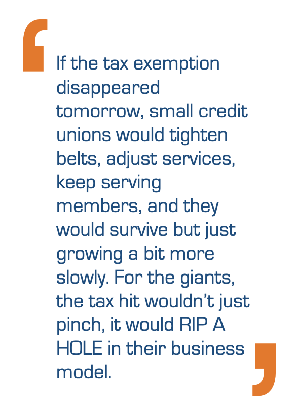 “If the tax exemption disappeared tomorrow, small credit unions would tighten belts, adjust services, keep serving members, and they would survive but just growing a bit more slowly. For the giants, the tax hit wouldn’t just pinch, it would RIP A HOLE in their business model.