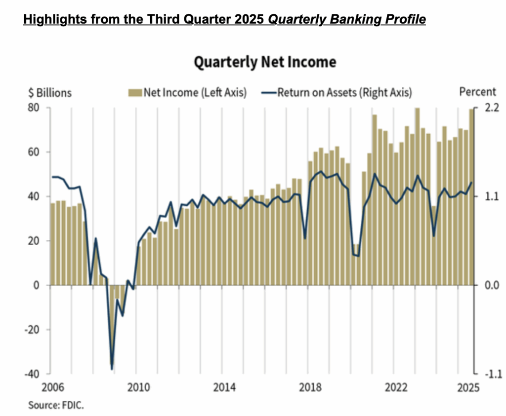 “The banking industry reported an aggregate ROA of 1.27% in third quarter 2025, up from 1.13% in second quarter 2025 and 1.09% in the year-ago quarter. The quarterly increase in net income was driven by lower provision expense (down $9.2 billion, or 30.7%) and higher net interest income (up $7.6 billion, or 4.2%), which were offset by higher income taxes (up $5.0 billion, or 30.1%) and higher noninterest expense (up $2.9 billion, or 1.9%),” the FDIC said.