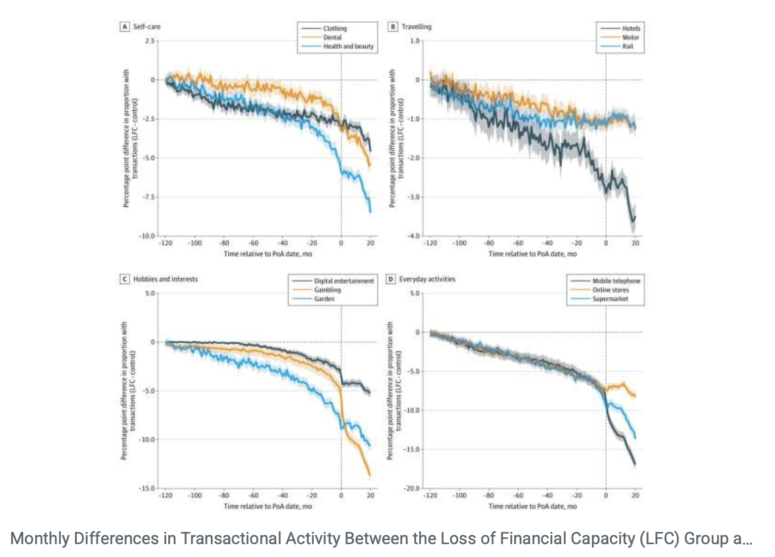 According to the report, the study analyzed anonymized banking records from over 66,000 individuals. It compared 16,742 individuals who were registered for power of attorney (PoA) due to a loss of financial capacity with a control group of 50,226 matched individuals without reported capacity loss.
