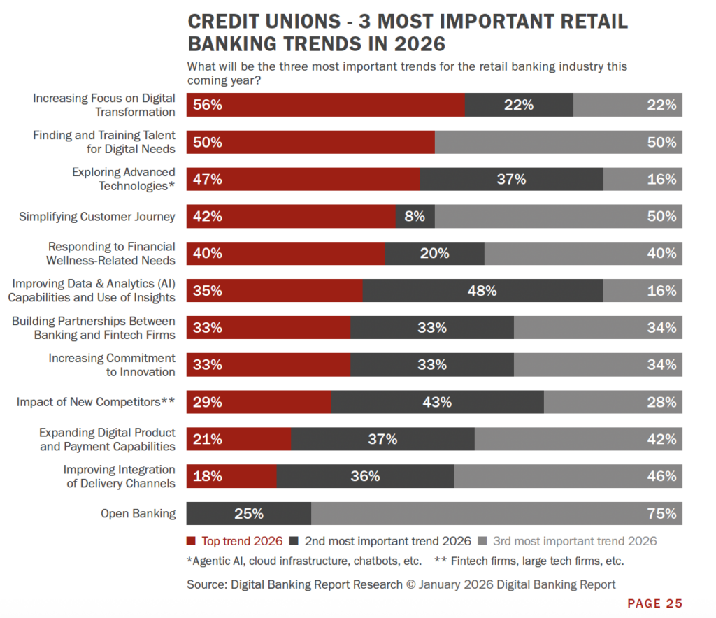 “For credit unions, digital transformation ranks as the top priority, cited by 56% of respondents, compared to 46% across banks and credit unions overall,” the report survey said. “Talent development is nearly as critical, with 50% of credit unions ranking finding and training digital talent as a top trend, compared to just 9% in the broader industry.