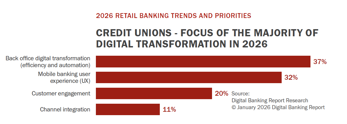 In general, where credit unions see challenges aligns with other industries, the report states. But when the focus is on digital transformation efforts, the Q2 analysis found credit unions are far more concentrated on back-office digital transformation than the industry as a whole, with 37% of credit unions stating that efficiency and automation will be the primary focus of their efforts in 2026, compared to 33% across the broader industry.