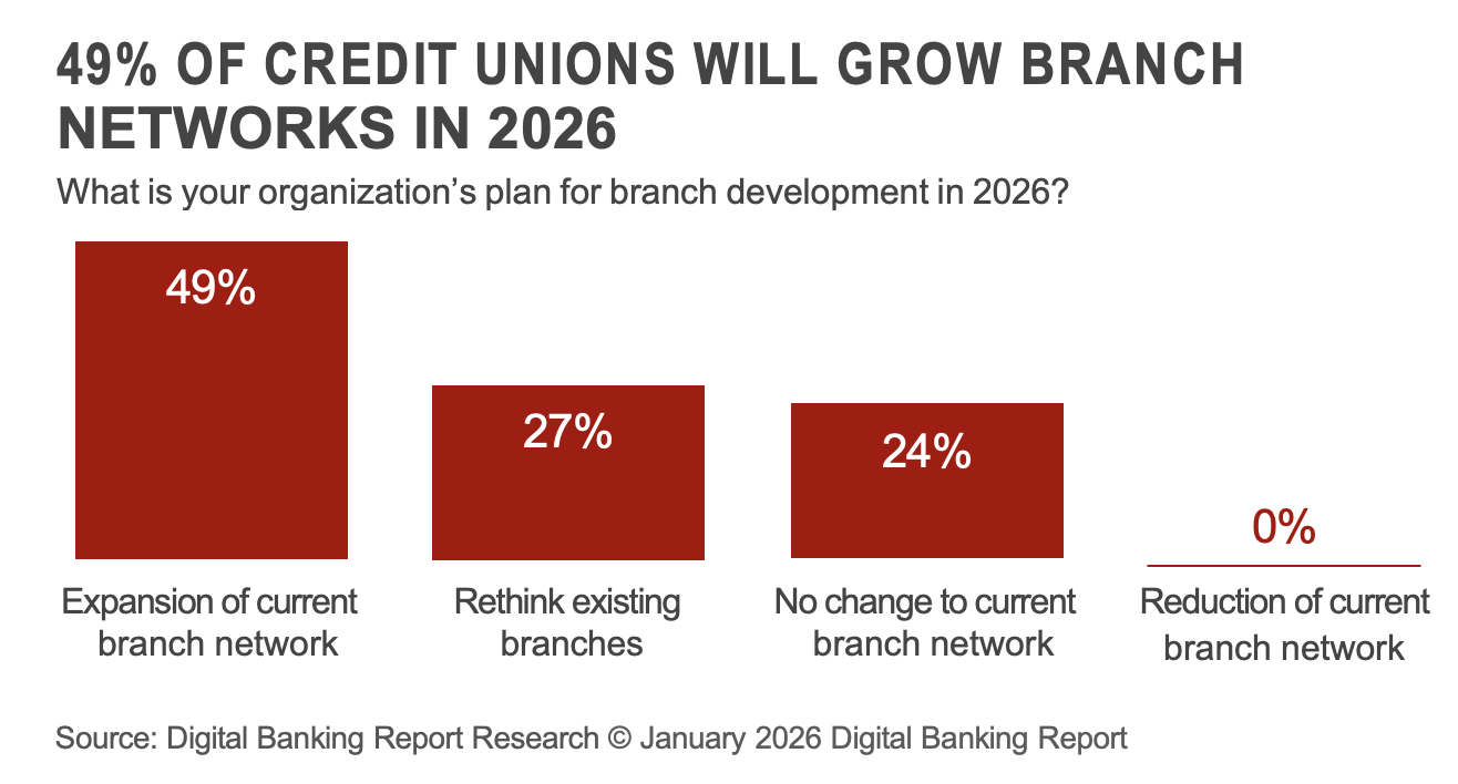 The biggest contradiction for the banking industry overall, especially for credit unions, is that credit unions prioritize digital transformation at 56% compared to 46% industry-wide, yet 49% of credit unions plan to expand their branch networks in 2026, compared to just 42% of the broader industry, Q2 stated in its analysis.