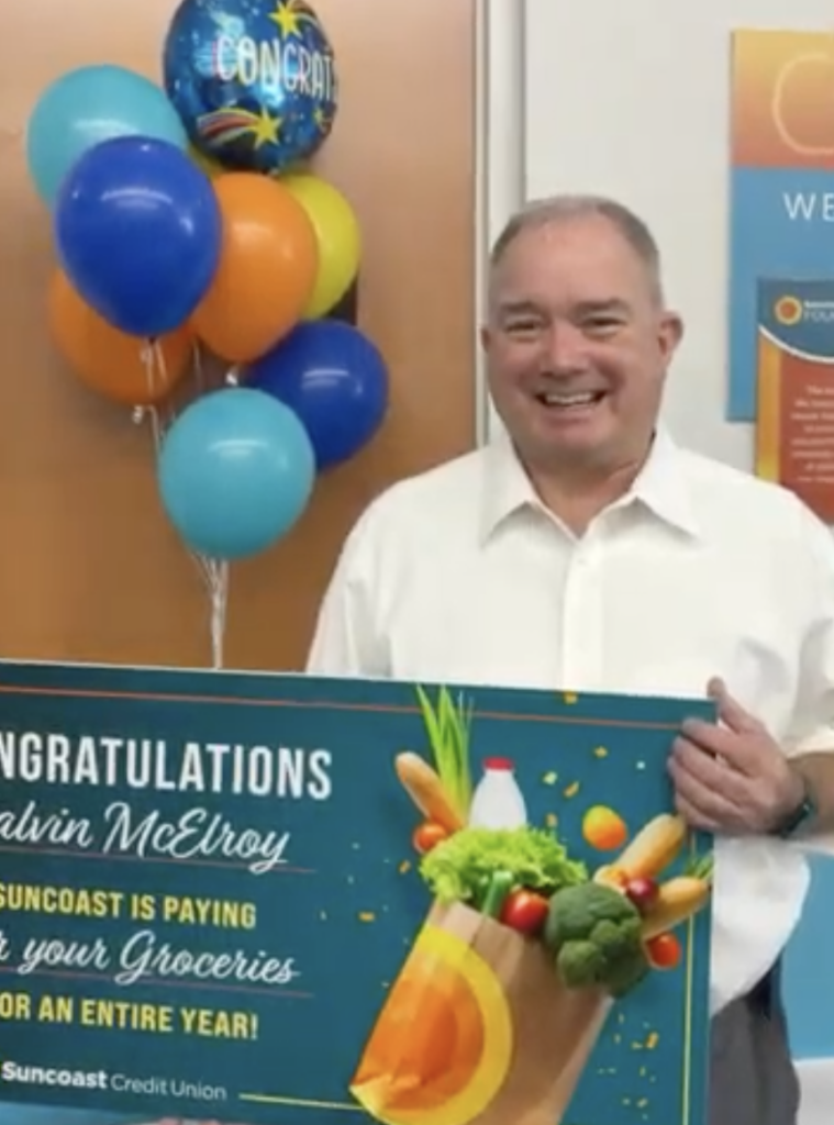 The credit union said Calvin McElroy of Auburndale received a $14,400 check during a March 19 ceremony after being selected as the winner of its Grocery Giveaway. The promotion invited members to enter by switching their direct deposit to Suncoast, while existing members with direct deposit were also eligible.