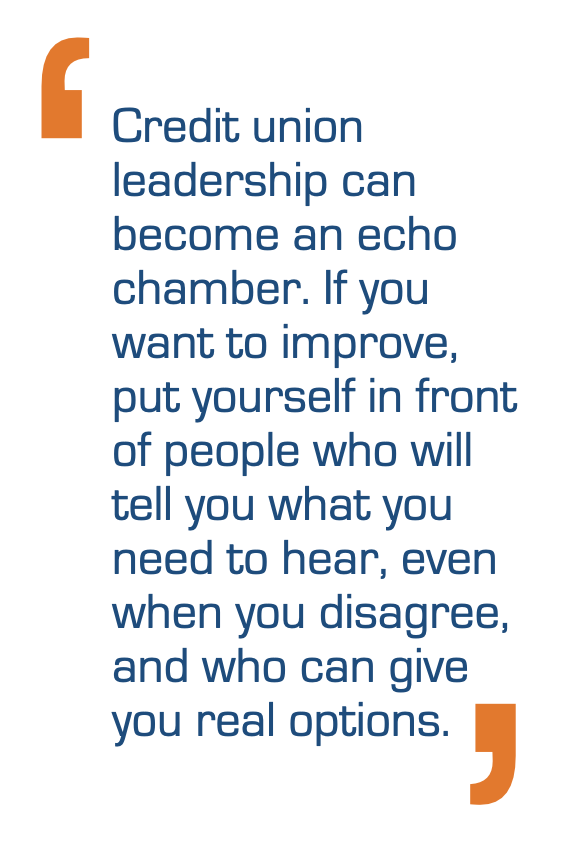 Credit union leadership can become an echo chamber. If you want to improve, put yourself in front of people who will tell you what you need to hear, even when you disagree, and who can give you real options.