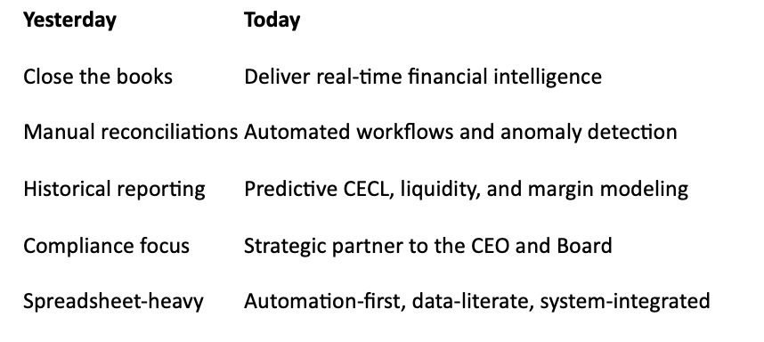 That level of candor pushed us deeper into the work. We began examining job descriptions, organizational positioning, and the real ROI behind modernizing key roles. When we looked closely at the finance function, especially the VP of Finance or Controller depending on size, the gap between legacy expectations and 2026 realities became impossible to ignore. What credit unions need from this role today is fundamentally different from what most job descriptions still describe.