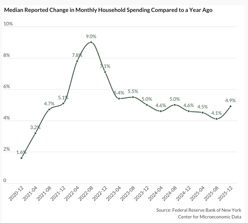 The New York Fed’s latest Survey of Consumer Expectations, released Tuesday, shows households reported a median 4.9% year-over-year increase in nominal monthly spending in December, up from 4.1% in August and higher than a year earlier. While well below the post-pandemic surge of 2022, the data suggest spending growth has stabilized above pre-pandemic levels rather than continuing to slow.