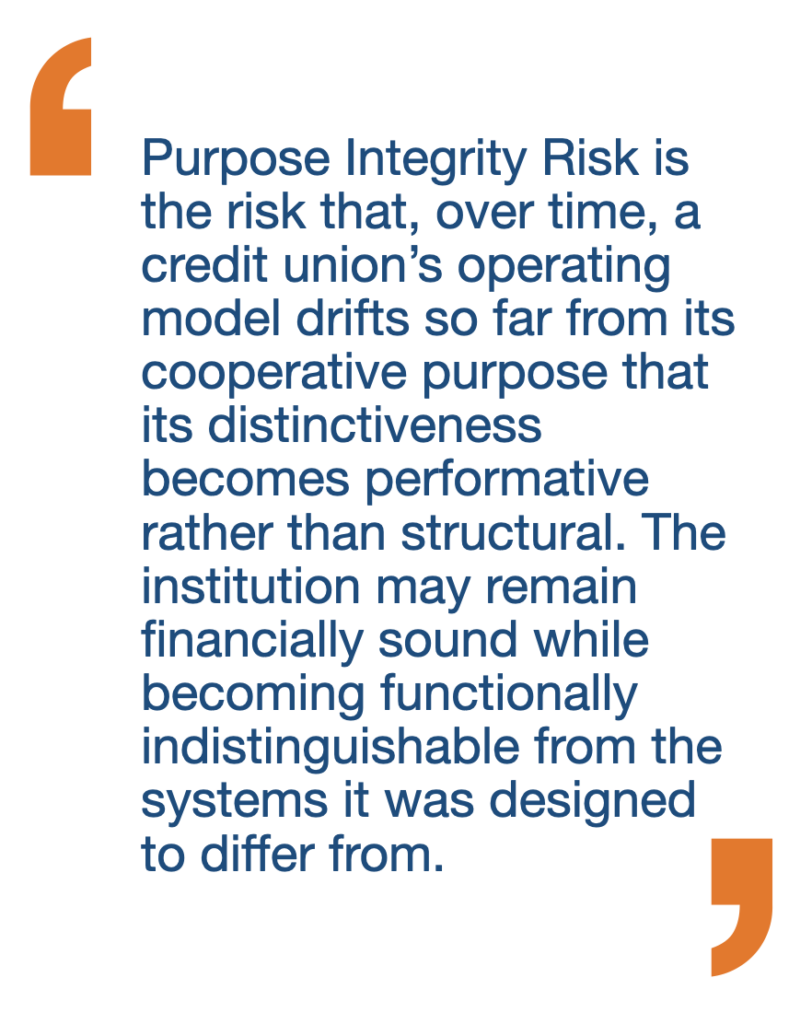 Purpose Integrity Risk is the risk that, over time, a credit union’s operating model drifts so far from its cooperative purpose that its distinctiveness becomes performative rather than structural. The institution may remain financially sound while becoming functionally indistinguishable from the systems it was designed to differ from.