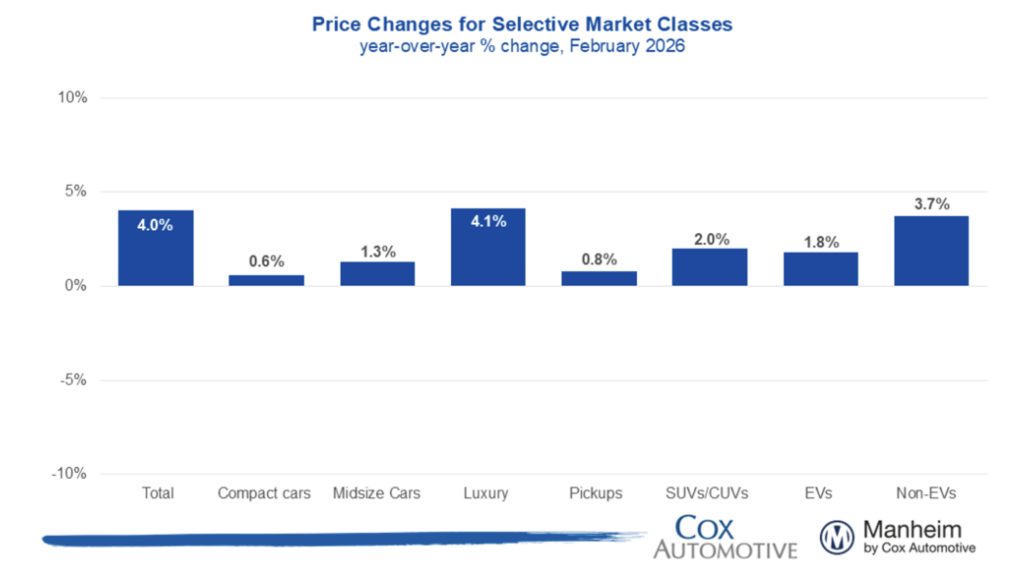 “Since the start of 2026, we’ve seen mostly solid demand at Manheim with higher sales conversion rates indicating an appetite from dealers to buy,” Robb said. “As we progressed through February, we saw prices move higher than usual, especially in the back half of the month.”