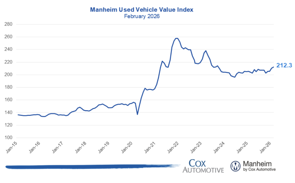 The Manheim Used Vehicle Value Index climbed to 212.3 in February, a 4% increase from February 2025 after adjusting for mix, mileage and seasonality. The index rose 0.8% from January. Historically, February prices tend to decline slightly, with a long-term average monthly move of a 0.2% decrease, the company noted.