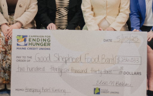 WESTBROOK, Maine–With hunger rates climbing and food pantries across Maine facing “critical shortages,” Maine Credit Unions’ Campaign for Ending Hunger is reporting it has provided a $236,033 donation to the Good Shepherd Food Bank.